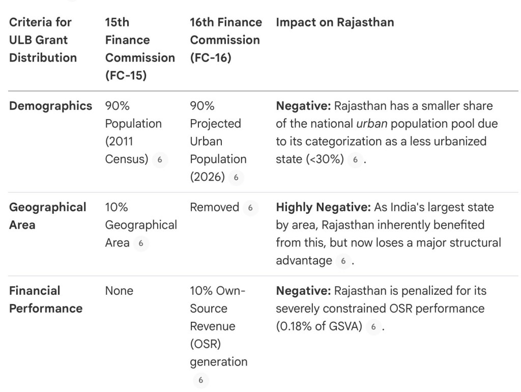 Under the new FC-16 formula, Rajasthan’s inter se share for the ULB grant pool is fixed at 5.21%. The shift from a formula that rewarded geographical size to one that rewards urban population size and municipal revenue generation strongly indicates that Rajasthan has lost its previous structural advantages in securing urban grants.